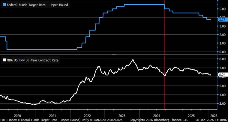 Lastly, regarding all the Fed hoopla, we’ve seen that a lower policy rate doesn’t necessarily translate to cheaper consumer borrowing levels. The benchmark 10-year Treasury note yield has risen since the Fed began cutting in September 2024.