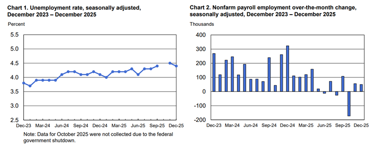 The December jobs report, published in early January, painted a mixed picture. The 50,000-payroll gain was below forecasts, but the unemployment rate fell a notable 0.16 percentage points to 4.38% from November. Markets didn’t react much to the data, as it largely confirmed what we knew—the labor market is stagnant.
