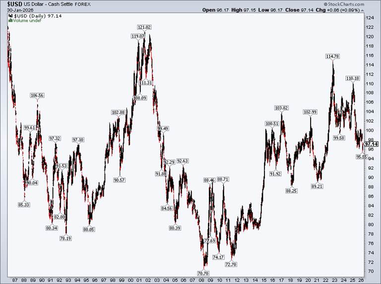“Sell America,” “debasement trade,” and chatter of a dollar collapse have made the rounds, but we believe those dramatic taglines are overblown. Go back 30–40 years, and you’ll see that the U.S. Dollar Index has ranged from 70 to 120, making today’s 97 level look very normal. In fact, it could fall to 90 and still be in line with historical norms.